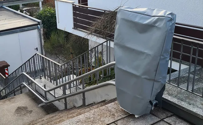 Dış mekan merdiven asansörlerimiz, merdiven asansörünü buzdan ve kardan korumak için konforlu, hava koşullarına dayanıklı bir örtüyle birlikte gelir ve her zaman temiz ve kuru kalmasını sağlar.
